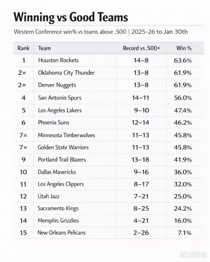 根据数据统计显示,火箭队开赛至今面对胜率超过50%的强队时,战绩为14胜8负,胜率高达63.6%,力压雷霆与掘金高居西部第一。