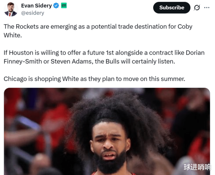 “如果火箭愿意送出一枚首轮+芬尼史密斯或者亚当斯,公牛队肯定会认真考虑”Evan Sidery写道。